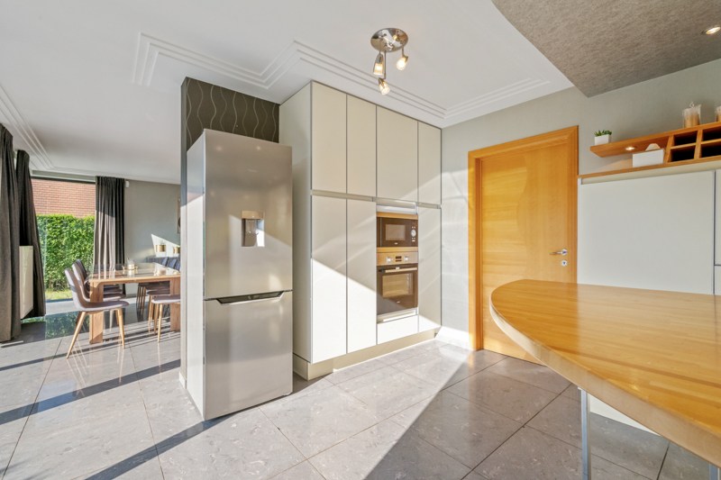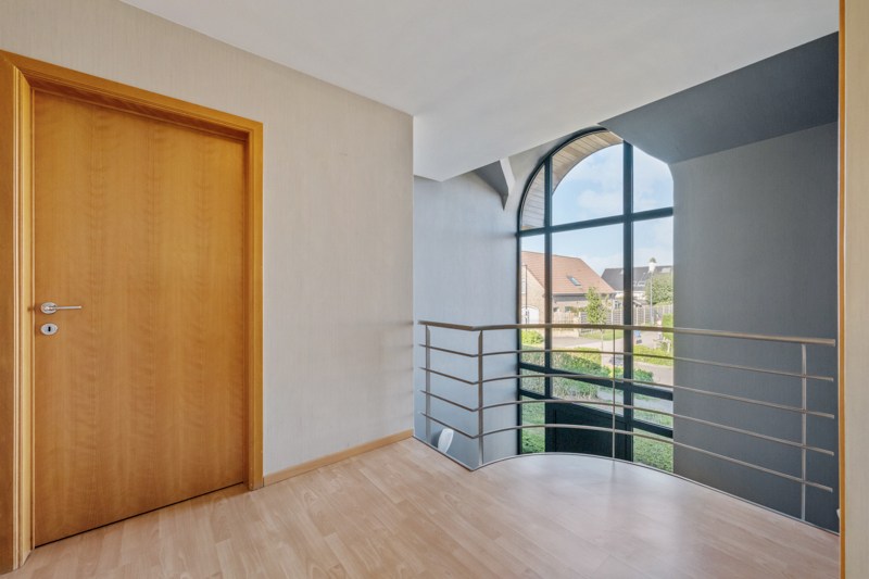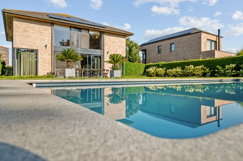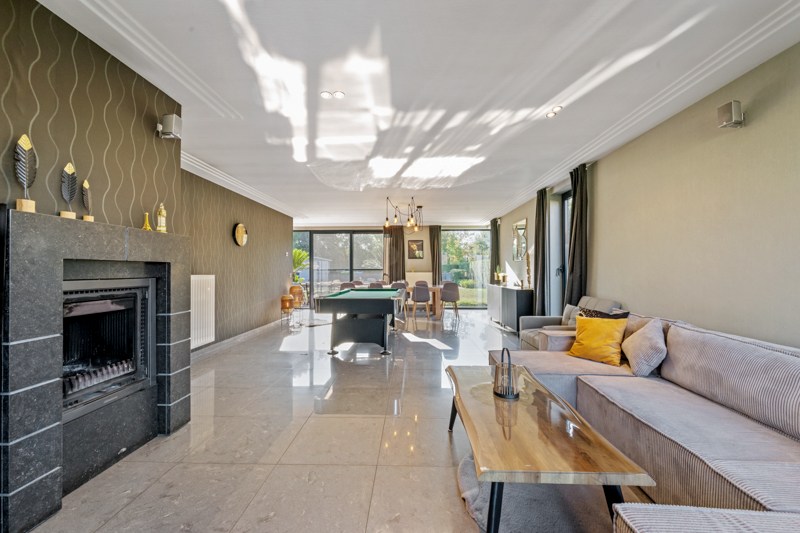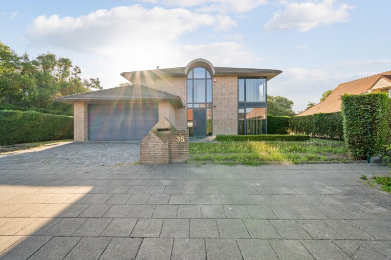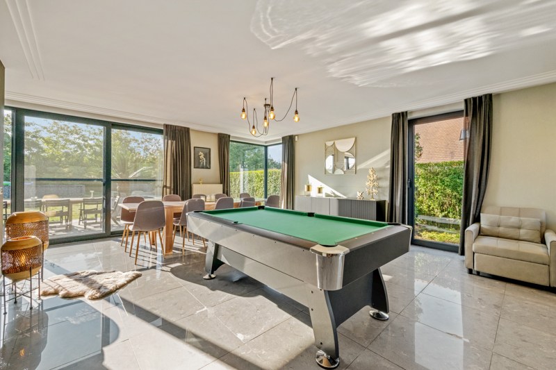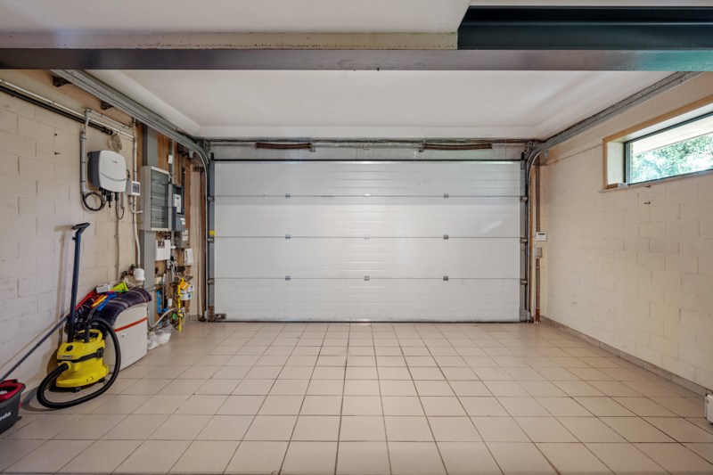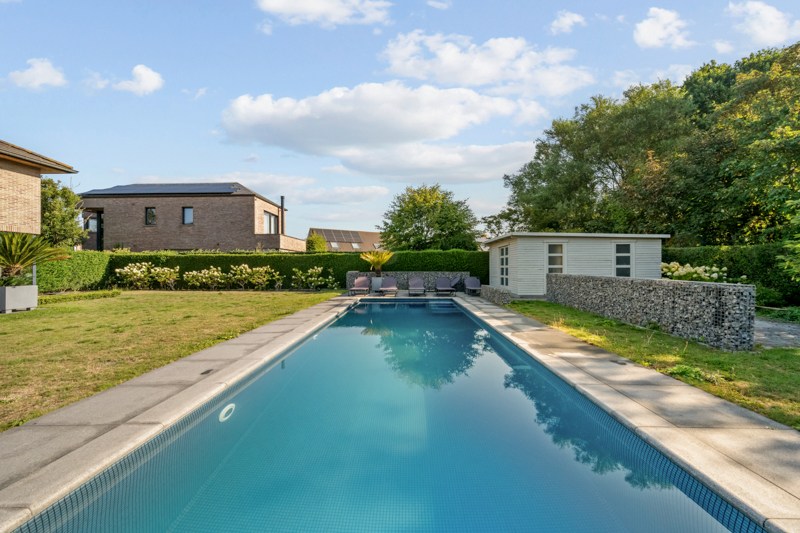 Riante inkomhall (open tot in het dak), afzonderlijk toilet met lavabo, berging/wasplaats met regenwaterpomp, ruime woonkamer 55m² (5x11m) met openhaard, open ingerichte leefkeuken (6x4m), grote dubbele garage (5,5x6m) met oprit voor twee wagens, open nachthall, 3 ruime slaapkamers waarvan één met grote dressing (mogelijkheid tot extra slaapkamer), badkamer met wastafel, ligbad, douche en twee toilet, grote bergkamer, grote geïsoleerde zolder, prachtig aangelegde zonnige tuin (zuid-gericht) met terras, groot verwarmd zwembad (3,5x11m), tuinhuis.