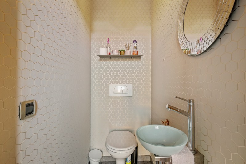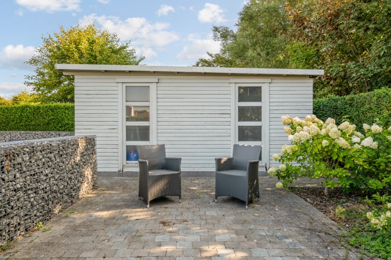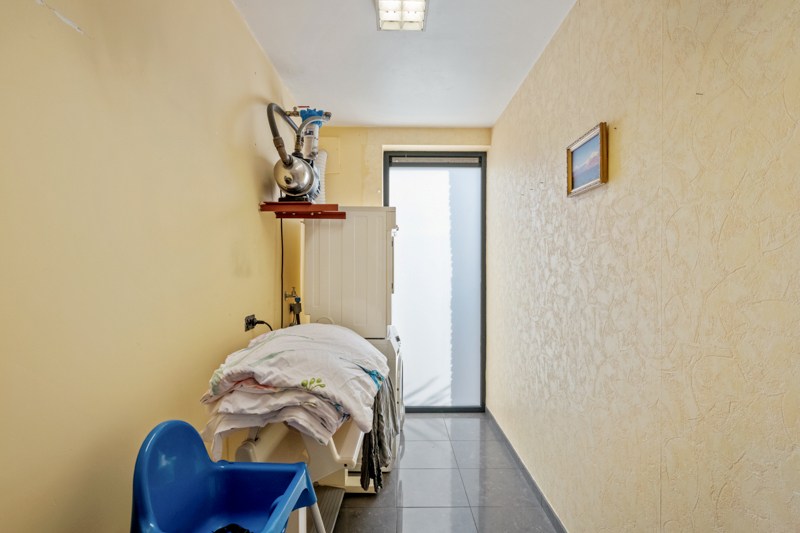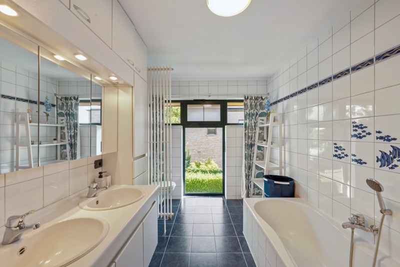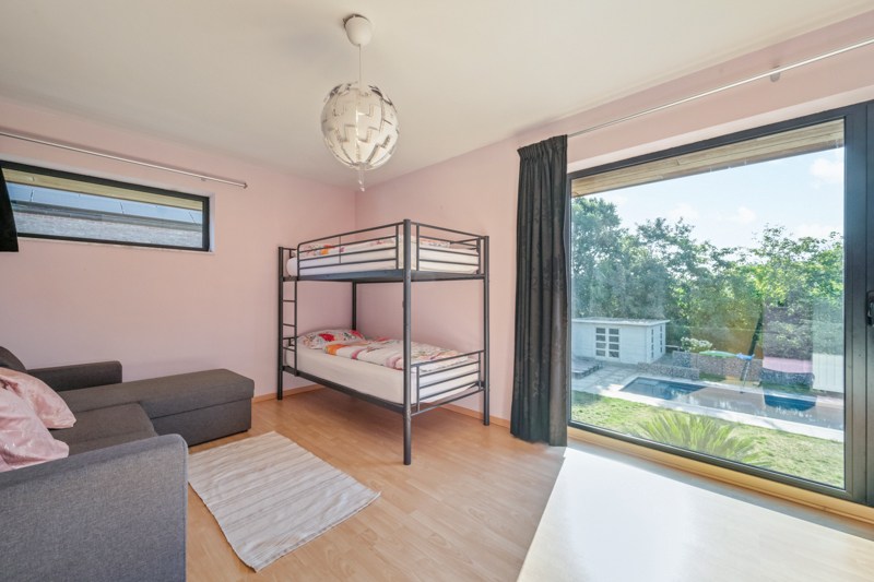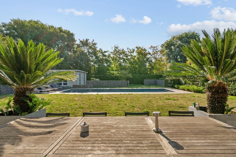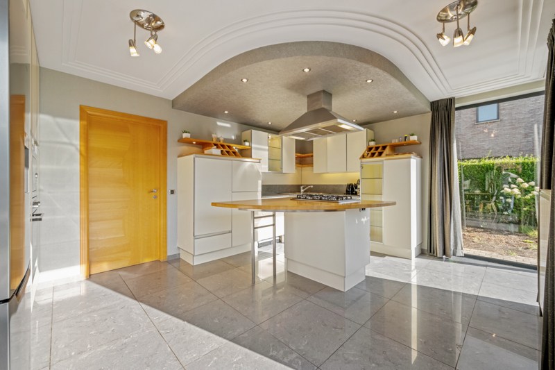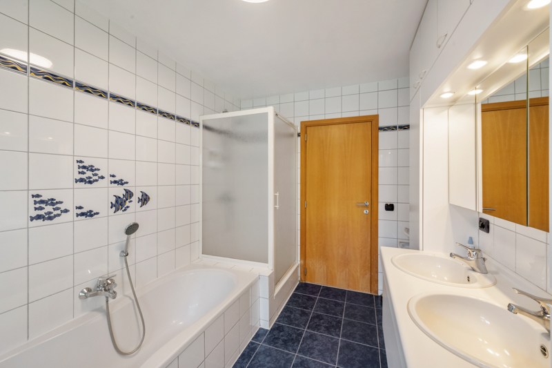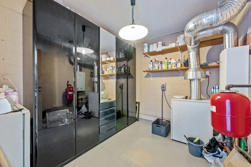 Riante inkomhall (open tot in het dak), afzonderlijk toilet met lavabo, berging/wasplaats met regenwaterpomp, ruime woonkamer 55m² (5x11m) met openhaard, open ingerichte leefkeuken (6x4m), grote dubbele garage (5,5x6m) met oprit voor twee wagens, open nachthall, 3 ruime slaapkamers waarvan één met grote dressing (mogelijkheid tot extra slaapkamer), badkamer met wastafel, ligbad, douche en twee toilet, grote bergkamer, grote geïsoleerde zolder, prachtig aangelegde zonnige tuin (zuid-gericht) met terras, groot verwarmd zwembad (3,5x11m), tuinhuis.